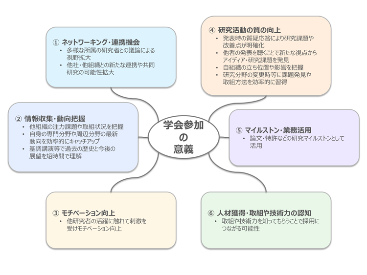 さらに、今回ヒアリングした若手研究者から直接的には出なかったが、論文執筆からプレゼンまでの学会発表というプロセスを通じて、研究者の「論理構成力」や「プレゼンスキル」などの向上の機会、育成の場としても有効だと感じている。社内の限られたメンバ間での議論から離れて、幅広い分野の人にわかりやすく伝わるように記載し、緊張感のある場面で発表するという経験は研究者の成長につながっている。