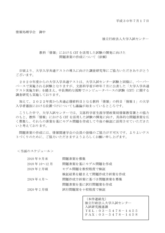 大学入試センターより『教科「情報」におけるCBTを活用した試験の開発に向けた 問題素案の作成について』の協力依頼がございましたのでご案内申し上げます.会員各位におかれましても「問題素案」をご応募いただけましたら幸いに存じます.ご協力のほどよろしくお願いいたします.