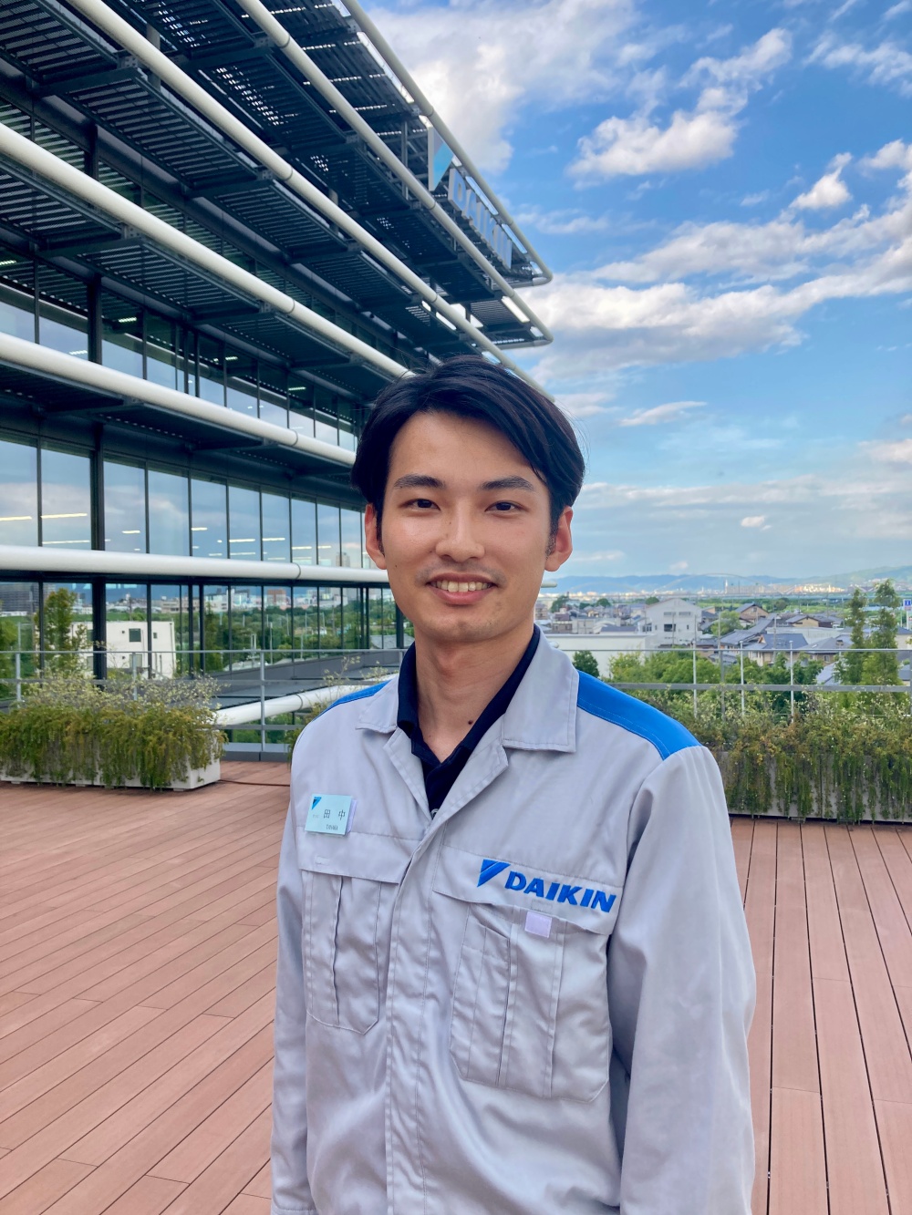 田中 斉(テクノロジー・イノベーションセンター) 【略歴、プロフィール】 「ヒトに関係する仕事につきたい」「自分が成長できる会社」を軸に就職活動を行い、2021年に新卒でダイキンへ入社。ダイキン情報技術大学で、1年目はAI・IoTの基礎知識や活用方法を学び、2年目は学びを活かして社内の各部署で、実際の職場での課題解決に取り組む。3年目から現在の部署へ配属となり、製造現場で働く『人』に焦点を当て、働く人がよりいきいきと働けるようになるための施策立案・システム開発を担当。 |